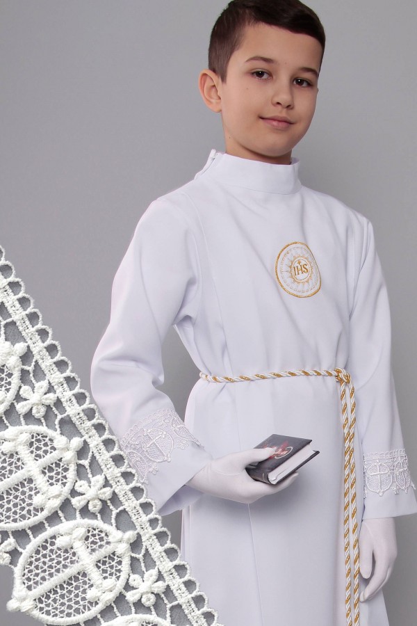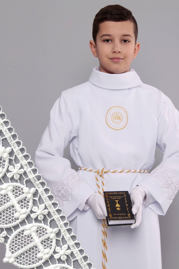 Des aubes élégantes avec un chevauchement depuis l'épaule sont conçues pour tous les enfants - elles sont magnifiques aussi bien sur les filles que sur les garçons. Vous pouvez choisir une coupe typique ou avec des plis plus larges et appuyés. Nous vendons des modèles simples, ainsi que ceux ornés d'un cordon doré ou d'une guipure (vous pouvez décider parmi plusieurs motifs pour la décoration des manches). Les aubes avec col montant ou capuches sont décorées à la taille avec des écharpes en satin, ainsi qu'avec des cordons dans plusieurs couleurs. L'ensemble est agrémenté d'une délicate hostie en or ou en couleur blanche.