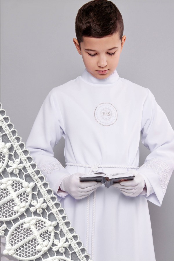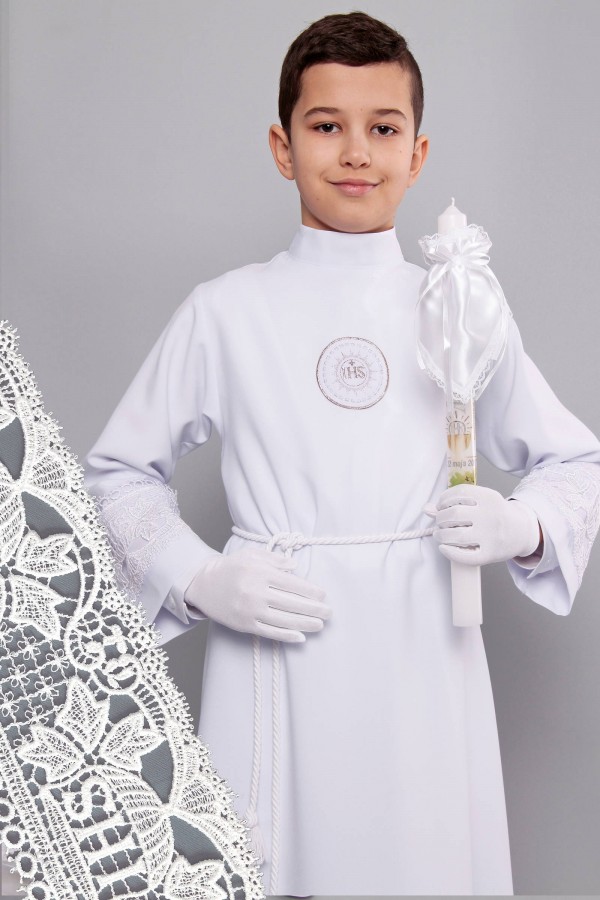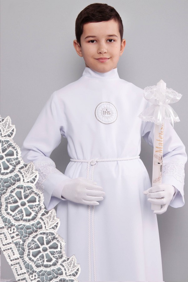 Des aubes de communion prolongées sont cousues pour tous les enfants - filles et garçons paraissent très élégants dans ces tenues. Nous les fabriquons avec des tissus tels que la gabardine, la georgette, mais vous devriez vérifier si le modèle que vous choisissez présente dans les options de choix tous les matériaux mentionnés (il existe des coupes cousues uniquement en gabardine). Les aubes peuvent avoir des cols ou des capuches. Il y a aussi des aubes qui se ferment par une fermeture éclair à l'avant. Certaines comportent de grands cols brodés ou en forme de cône, des manches ornées de guipure, des ceintures de satin et des cordons. Il existe également des imprimés intéressants (IHS, Notre-Dame de Czestochowa, Cœur de NPJ).