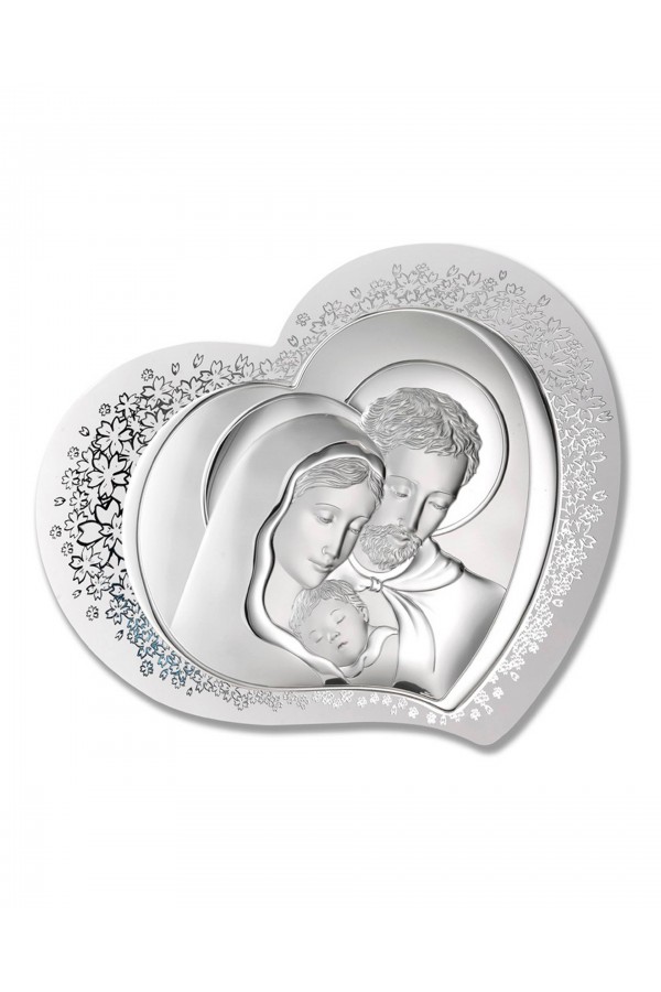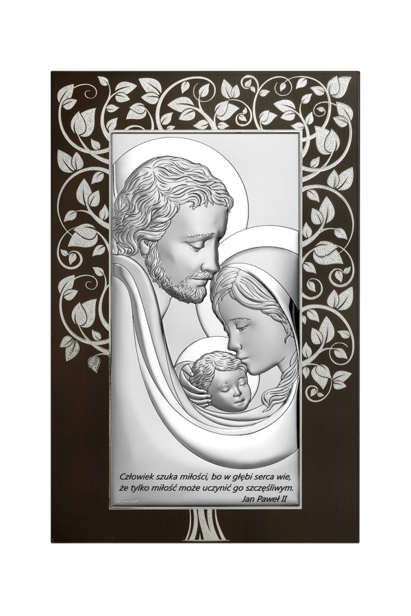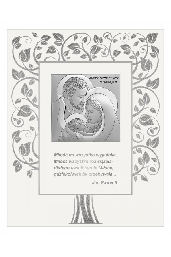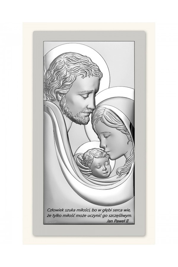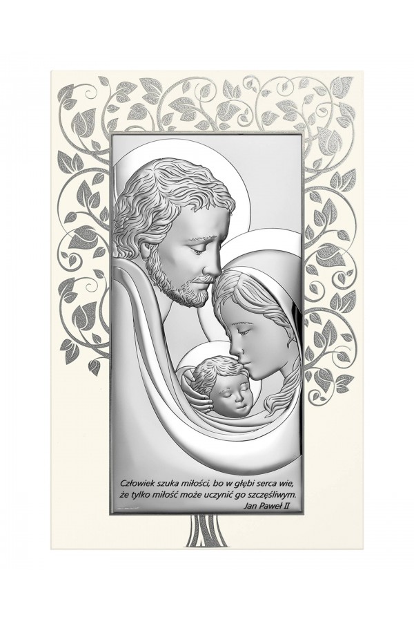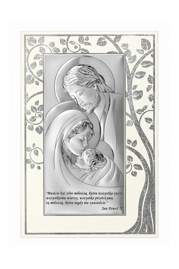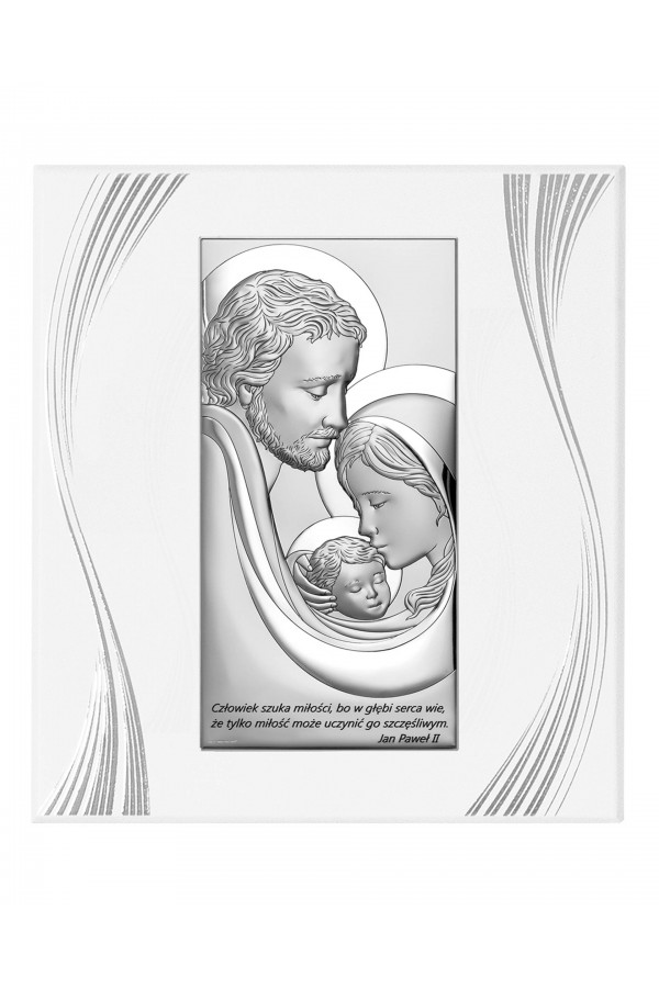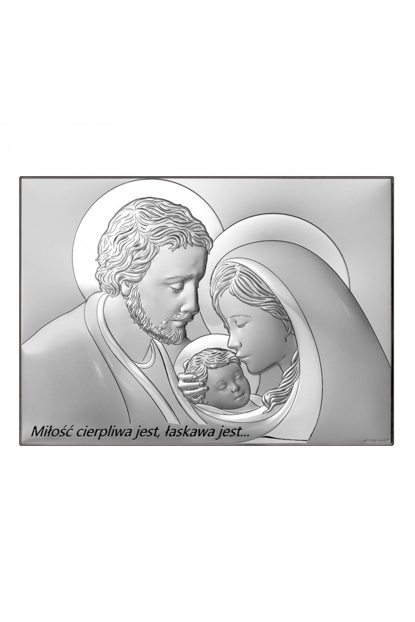Les souvenirs de communion en argent ornés d'images gravées ou en relief de saints sont un cadeau très populaire offert aux enfants le jour de leur Première Communion. Les figures d'anges et la Sainte Famille sont particulièrement appréciées des enfants. Joseph, Marie et le petit Jésus symbolisent la famille, la foi, l'espérance et la chaleur du foyer, donc leur image sur le souvenir est un très joli cadeau rappelant la réception du sacrement de la Première Communion. Le bas-relief représentant la Sainte Famille est présenté sur l'image rectangulaire, ainsi que dans le motif d'un cœur, d'un nuage ou de plantes, ce qui plaît particulièrement aux enfants et leur rappelle cette journée spéciale pour eux.
