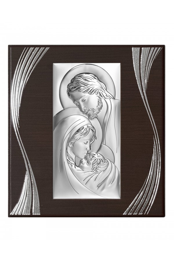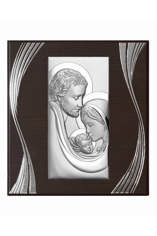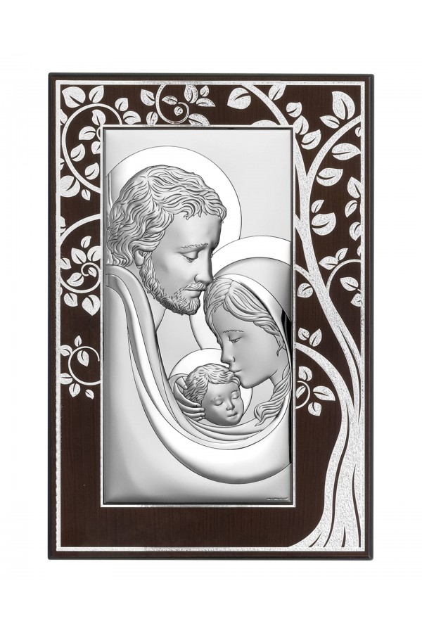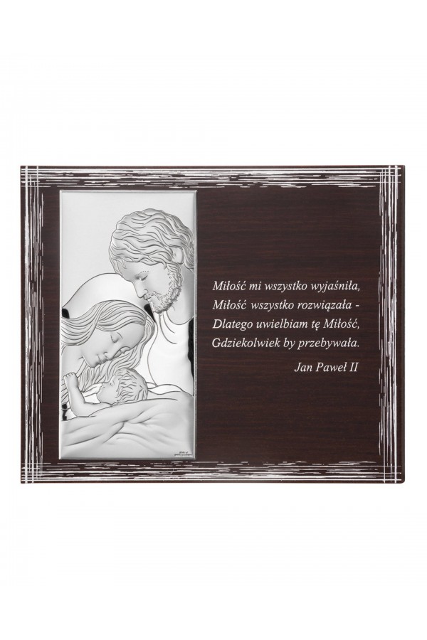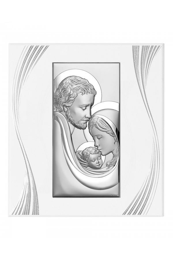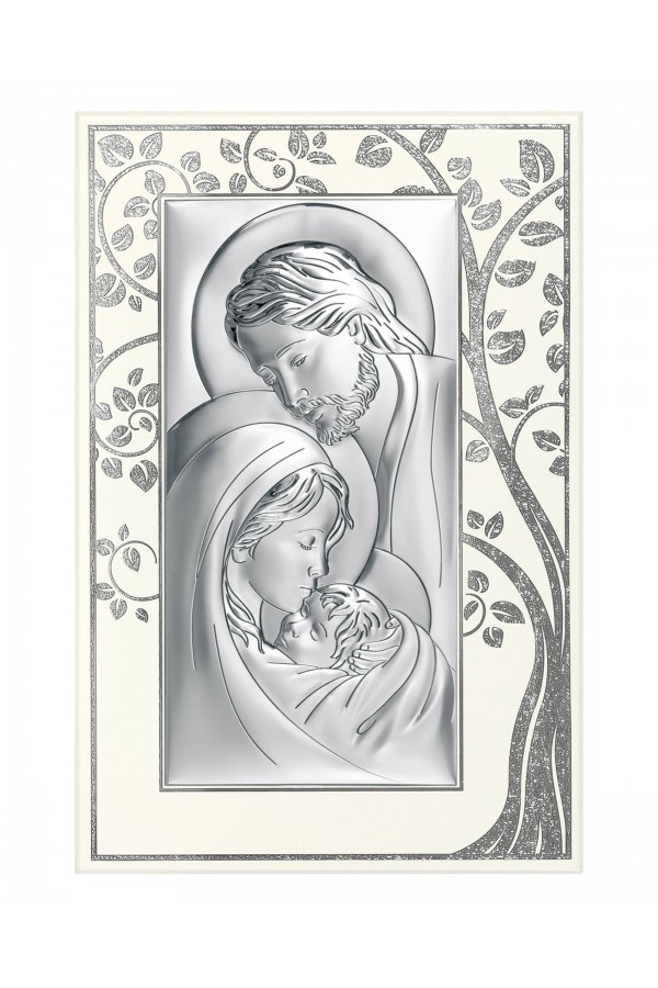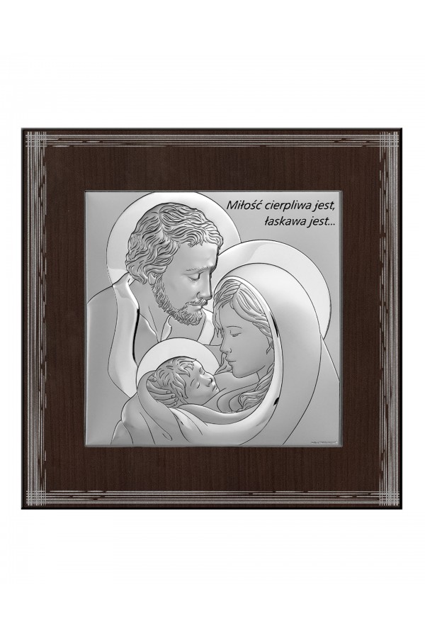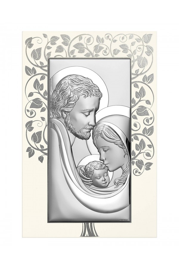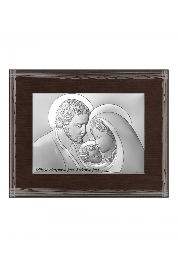 Les souvenirs de communion en argent ornés d'images gravées ou en relief de saints sont un cadeau très populaire offert aux enfants le jour de leur Première Communion. Les figures d'anges et la Sainte Famille sont particulièrement appréciées des enfants. Joseph, Marie et le petit Jésus symbolisent la famille, la foi, l'espérance et la chaleur du foyer, donc leur image sur le souvenir est un très joli cadeau rappelant la réception du sacrement de la Première Communion. Le bas-relief représentant la Sainte Famille est présenté sur l'image rectangulaire, ainsi que dans le motif d'un cœur, d'un nuage ou de plantes, ce qui plaît particulièrement aux enfants et leur rappelle cette journée spéciale pour eux.